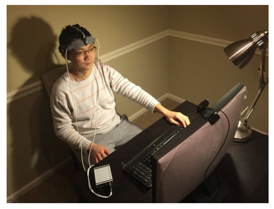 Each participant was instructed in the experimental procedure in detail before performing the experiment. Participants were asked to sit on a comfortable chair facing a computer screen in a quiet room. Both fNIRS and EEG sensors were placed on the participant’s forehead and scalp, respectively. There was no contact between these two hardware pieces. During the experiment, participants facial reactions to the stimuli were video recorded by a webcam. Each participant was required to minimize his head movements during the experiment in order to avoid signal artifacts from head movement. The experimental environment is shown in Figure 3. The study has been approved by the Institutional Review Broad of New Jersey Institute of Technology. Before the experiment, each participant was asked to sign an agreement to participate in the study.