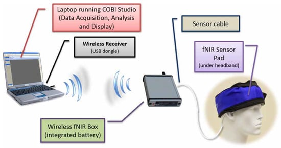 The neuroimaging systems used in this study consisted of two commercial products: a wireless fNIRS Model 1100W system (www.fnirdevices.com) and an Emotiv EPOC headset (www.emotiv.com). A compact and battery-operated wireless mini-fNIRS system was used to monitor the prefrontal cortex of the participant as shown in Figure 4. The system measures cortical oxygenation changes during the task and is composed of three modules: a sensor pad that holds near-infrared light sources and detectors to enable a fast placement of 4 optodes (2 light wavelengths channels and an ambient channel per optode), control box hardware for sampling all channels at 4 Hz, and a computer that runs COBI Studio software [] that controls data collection and receives the data wirelessly from the hardware. More information about the device and data collection procedures was reported in [].