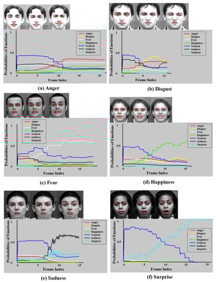 Recognition rates of emotion types as a function of frame index (time) in a video sequence. (a) Anger; (b) Disgust; (c) Fear; (d) Happiness; (e) Sadness; (f) Surprise.