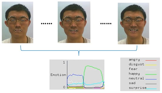 Inference of participants’ facial affective expressions is based on facial emotion recognition. Facial affective expressions can be influenced by various factors including age, gender, race, time of day, and the general health of the participant. To control for these factors, we calibrated our measurements over the first 5 s of facial expressions. During this 5 s calibration period, we computed the mean measures of all emotion states. We then subtracted these mean measures from the remainder of facial expressions for baseline adjustment []. The emotion type of a facial video clip v was recognized by calculating the largest probability among Anger, Disgust, Fear, Happiness, Neutral, Sadness, and Surprise expressed as