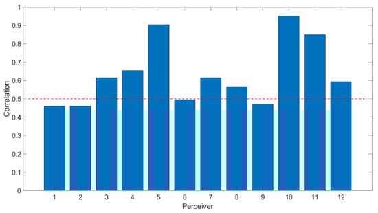Correlation of the participants’ facial affective states and the ground truth over all trials. The average is 0.5 marked with the red dashed line.