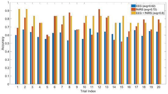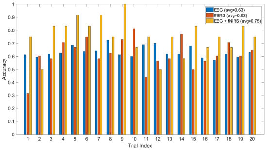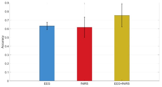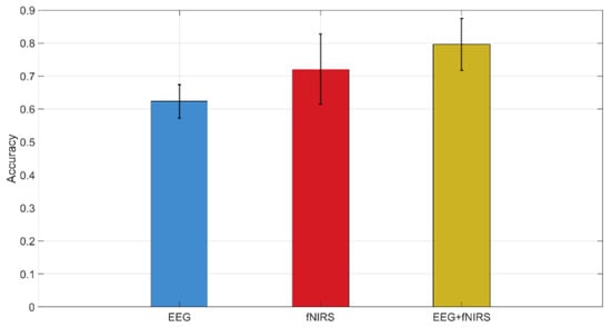 Comparison of the proposed method (EEG + fNIRS) and the ones where only EEG or fNIRS employed for all image-content trials.