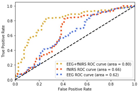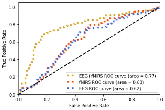 ROC curve comparison of the proposed method (EEG + fNIRS) and the ones where only EEG or fNIRS employed for all image-content trials