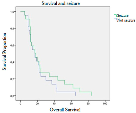 Half of our population started with epileptic seizures. The mean age of patients who started with seizures was 52.40 years (STD 12.58), OS 26.36 months (STD 22.05) vs. 21.04 (STD 14.52) with p-value = 0.350 and a mean PFS of 8.86 months (STD 11.56) vs. 11 (STD 12.33) in the control group. Preoperative KPS in patients with seizures was 81.13 (STD 19.87) vs. 85.95 (STD 9.95) of the controls with a p-value = 0.324. Postoperative KPS in patients with seizures was 80.22 (STD 18.15) vs. 80 (STD 15.11) of the controls and a p-value = 0.964, Figure 2.