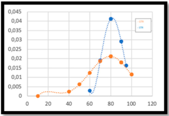 The difference between postoperative KPS in the GTR and STR groups was not statistically significant. However, the distribution of the sample showed that the STR group presented medium–high postoperative KPSs (between 60 and 100), while in the GTR group there were patients with low postoperative KPSs, as shown in Figure 4.