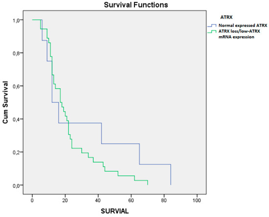 Patients with ATRX loss (Figure 6) had an OS of 30.75 months (STD 29.62), while patients without mutation had an OS of 22.13 months (STD 15.42) p-value = 0.241. The PFS of the group with the ATRX loss was 14.12 months (STD 17.51), while in the control group it was 9 months (STD 10.33), p-value = 0.274. The group of patients with ATRX loss had a preoperative KPS of 82.50 (STD 11.64) vs. a KPS of 83.71 (STD 16.77) in the normal type, p = 0.847. The ATRX loss group had a postoperative KPS of 76.25 (STD 16.85) vs. a KPS of 80.97 (STD 16.55) of the normal type ATRX group, p-value = 0.470.