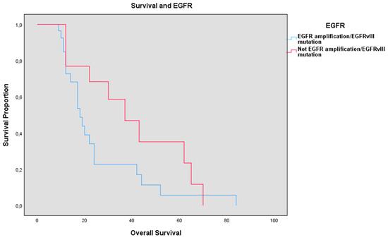 Patients with EGFR amplification/EGFRvIII mutation (Figure 7) had a mean OS of 19.83 months (STD 16.31) vs. 32 months (STD 21.15) of the control group with p-value = 0.035. The mean PFS in the EGFR amplification/EGFRvIII mutation group was 7.4 months (STD 7.84), whereas in the control group it was 15.75 (STD 16.79) p-value = 0.055. Preoperative KPS was 81.50 (STD 17.27) in the EGFR amplification/EGFRvIII mutation group vs. 88.07 (STD 11.08), p-value = 0.214, while average postoperative KPS was 80.51 (STD 12.94) vs. 77.14 (STD 22.97), p-value = 0.421.