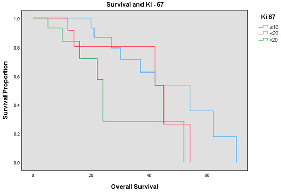 Ki-67 is a nonhistone nuclear protein, which is expressed throughout all active cell cycle phases, but not in the resting cell phase, G0. We evaluated the relationship between Ki-67 index and the outcome of patients. The analysis revealed that OS and PFS were inversely related with Ki-67 index. We divided our patients into three groups based on this parameter (Figure 6): <10%, between 10% and 20% and >20%. We found a statistically significant difference in terms of survival in the group with Ki-67 < 10% compared to the group with Ki-67 > 20% (p-value = 0.021).