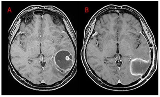 MRI T1WI axial sections. (A) Preoperative left parieto-occipital GBM and (B) postoperative images (EOR = 90%–100%, STR).