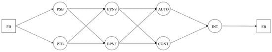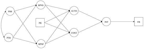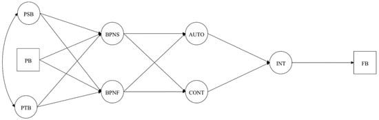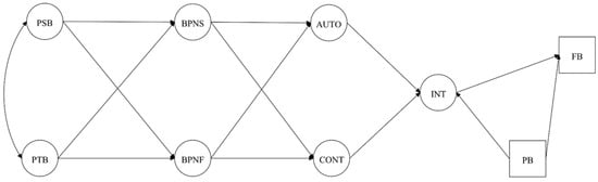 Hypothesized model with past behavior predicting intentions and future behavior. Note: PSB = Perceived Supportive Behaviors; PTB = Perceived Thwarting Behaviors; BPNS/F = Basic Psychological Needs Satisfaction/Frustration; AUTO = Autonomous Motivation; CONT = Controlled Motivation; INT = Intention; PB = Past Behavior; FB = Future Behavior.