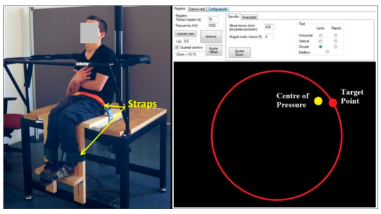 Following the protocol by Barbado et al. [7,8], participants were seated in a wooden chair placed on a force platform (Kistler, Switzerland, Model 9286AA at 1000 sample/s), crossing their arms firmly in front of their chest or as close as possible and the hip and the legs strapped to the seat (90° knee flexion) (Figure 1). All tasks, except one, required that participants adjust his/her center of pressure (CoP) position according to a target point, which was represented by a red dot (radius = 60 mm), shown on a 106 × 138-cm screen and placed at 3.5 m in front of the participant. Real-time visual feedback of participant’s center of pressure (CoP) displacement was represented by a yellow dot (radius = 60 mm), also shown on the screen (see Figure 2).