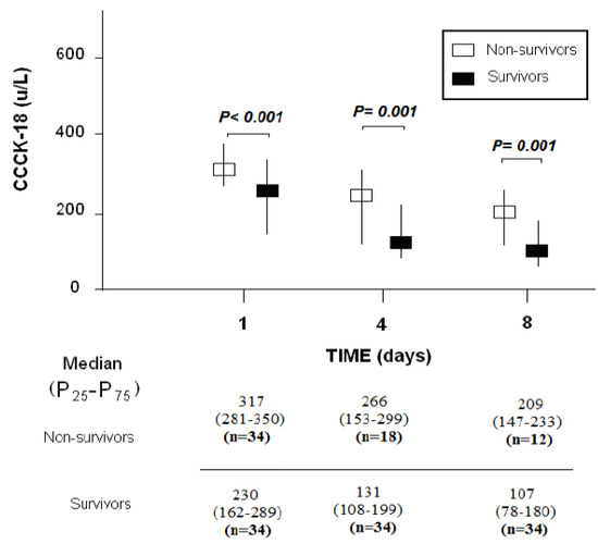 In surviving, compared to non-surviving patients, we found lower serum CCCK-18 levels at days 1 (p < 0.001), 4 (p = 0.001) and 8 (p = 0.001) of MMCAI (Figure 1).