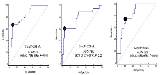 ROC curve analyses showed that serum CCCK-18 concentrations at days 1, 4, and 8 of MMCAI had an AUC (95% CI) predicting a 30-day mortality of 0.83 (0.72–0.91; p < 0.001), 0.78 (0.65–0.89; p < 0.001) and 0.82 (0.68–0.92; p < 0.001), respectively (Figure 2). Table 2 shows sensitivity and specificity, positive and negative likelihood ratios, and positive and negative predicted values and a 95% CI of serum CCCK-18 levels cut-off at day 1 (>298 U/L), day 4 (>229 U/L) and day 8 (>186 U/L) for mortality prediction.