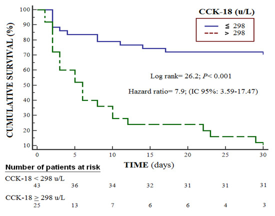 Survival curves at 30 days using serum levels of caspase-cleaved cytokeratin (CCCK)-18 higher or lower than 298 u/L.