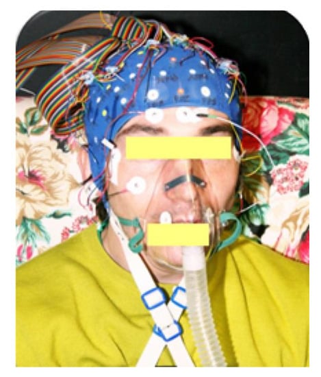 A picture of a participant wearing the mask connected to the hypoxicator apparatus which provided air impoverished of a 12.5% of oxygen during the electroencephalogram (EEG) recording session.