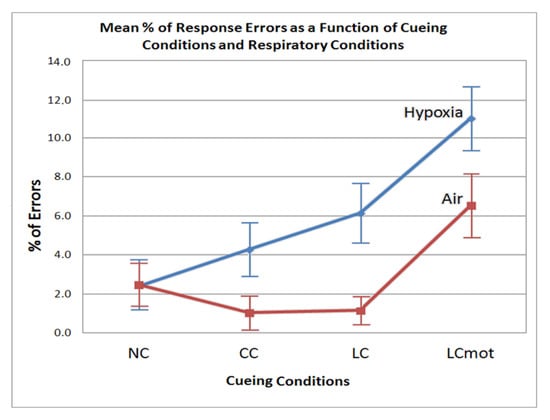 In hypoxia, instead, the post-hoc contrasts indicated that error percentage rates progressively and significantly increased from NC to LCmot cueing conditions: NC vs. CC, p < 0.0002; NC vs. LC, p < 0.0001; NC vs. LCmot, p < 0.0001, respectively. Moreover, CC was also different from LC (p < 0.0002) and from LCmot (p < 0.00001), and, in turn, LC was different from LCmot (p < 0.0001). Due to the aforementioned increases, with the exception of NC, the CC, LC and LCmot cueing conditions showed significantly higher error rates in hypoxia than in air (i.e., p < 0.001 for CC; p < 0.0001 for LC; p < 0.000025 for LCmot; see Figure 3 again).