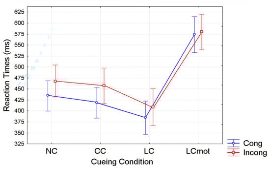 Post-hoc comparisons showed that, except for the LCmot cueing type, response times were much faster for all the other cueing conditions when target-strings were congruent than incongruent (i.e., NC (p < 0.00002), CC (p < 0.0002) and LC (p < 0.0002), respectively; see Figure 4). Post-hoc contrasts also indicated that RTs were slower for NC than for both CC (Cong: p < 0.0002; Incong: p < 0.0002) and LC (Cong: p < 0.0002; Incong: p < 0.0002), and in turn for CC than LC for both target flanker types (Cong: p < 0.0002; Incong: p < 0.0002). Further contrast analyses proved that LCmot obtained much slower RTs than the other three cueing conditions, namely NC, CC, and LC, for both target congruency conditions (Cong: LCmot vs. NC, p < 0.0002; LCmot vs. CC, p < 0.0002; LCmot vs LC, p < 0.0002; Incong: LCmot vs. NC, p < 0002; LCmot vs. CC, p < 0.0002; LCmot vs. LC, p < 0.0002; see Figure 4 again).