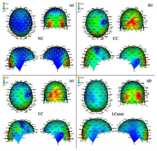 Three-dimensional (3D) maps of the topographical distribution of alpha power over the scalp as a function of the cueing-conditions grand-averaged over the respiratory conditions, and drawn from the top, the back, the right, and the left points of view, respectively. Time = 0 to 1500 ms, frequency = 7.5–12.5 Hz. (a): NC condition; (b): CC condition; (c): LC condition; (d): LCmot condition. Note that the scale of alpha power values (in µV2) is unalike in the different attentional-cueing conditions. Note also that while the alerting but spatially unpredictable, exogenous-orienting of attention to target (CC) condition showed the highest alpha power, the fully uncued, exogenous-orienting of attention to target (NC) condition was characterized by the lowest alpha power.