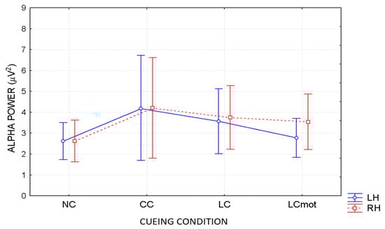 Most interestingly, the data also indicated that introducing a neurocognitive perceptual (e.g., a target-type discrimination) and psychomotor overload (e.g., a double-choice motor task) as in the LCmot condition further increased alpha desynchronization over the LH, but not the RH. This left-sided increase in alpha desynchronization in LCmot with respect to both CC and LC showed to be of such a degree that the alpha for this cueing mode did show any differences from that for the exogenous NC task over the LH as compared to the RH. Conversely, LCmot elicited a same alpha power level as LC over the RH. As a result of the afore-mentioned changes, a prominent right-sided hemispheric asymmetry of the alpha power occurred for this motor-charged cueing-mode only (see EEG alpha-power maps drawn in Figure 5d, and Figure 6 for mean power values for this condition).