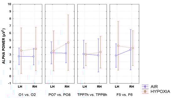 Additionally, hypoxia induced EEG alpha synchronization over the mesial-occipital areas of both the LH and RH (p < 0.04 and p < 0.0072, respectively). Hypoxia also induced stronger alpha synchronization than in ambient-air over the left-sided dorsolateral prefrontal scalp site (p < 0.0011) (see Figure 8 again for all these findings). Overall, however, at these anterior scalp regions EEG alpha synchronization was significantly stronger over the RH than the LH, but in air condition only (p < 0.034). Moreover, in hypoxia alpha synchronization showed to be much more prominent over the right parieto-occipital than over the temporo-parietal (p < 0.001) and the prefrontal (p < 0.046) scalp sites, while this topographical difference was much reduced in ambient-air condition and over the left hemisphere (p < 0.0011).
