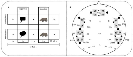 (A) Design of the study: event-related mini-block design. A total of 40 different colored pictures were presented twice (in inner and overt speech condition) in 16 blocks overall. Every block contained five trials of one condition. The blocks were pseudo-randomized over participants in four different versions. Each picture was cued by red speech (overt speech condition) or blue thinking (inner speech condition) bubbles. Pictures that had to be named (e.g., the rhinoceros) were taken from Rossion and Pourtois [] with image courtesy of the authors. (B) Simultaneous electroencephalography (EEG) electrodes and functional near-infrared spectroscopy (fNIRS) channel placement. A total of 32 EEG electrodes (e.g., Cz); stars: 8 NIRS light emitters; dots: 8 NIRS detectors. L1-8:8 left NIRS channels; R1-8:8 right NIRS channels, resulting from the light emitter-detector arrangement. Grey bars indicate the regions of interest (ROIs) of the fNIRS channels that were used for statistical analyses.