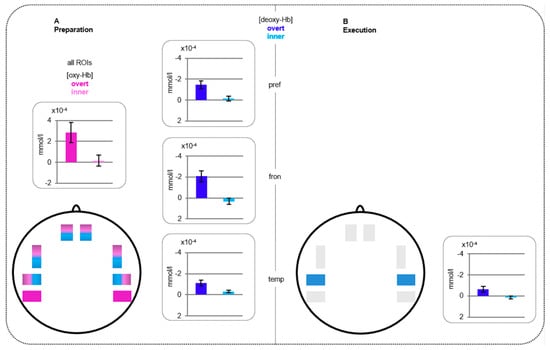 Functional near-infrared spectroscopy (fNIRS) results. Statistically significant differences between overt versus inner speech. (A) Beta-values for the preparation phase merged over all regions for oxy-hemoglobin (oxy-Hb; purple) and prefrontal, frontal, and temporal regions for deoxy-hemoglobin (deoxy-Hb; blue). (B) Beta-values for the execution phase at temporal regions for deoxy-Hb. Please note that a more positive value for oxy-Hb and a more negative value for deoxy-Hb (both plotted upwards here) are indications of increased activations.