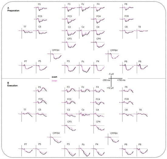 Event-related brain potentials (ERP) results. (A) Grand averages for the preparation phase. (B) Grand averages for the execution phase. Negative polarity is plotted upward.