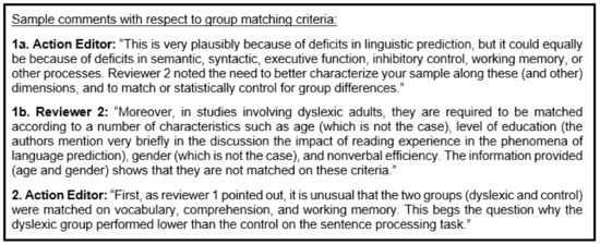 My experience as a cognitive psychologist trying to publish research on dyslexia has been quite difficult. For illustration purposes, I have included some sample comments from two action letters in Figure 2 below. My studies (conducted with a Phd student) focused on sentence comprehension in adults (mostly university students). In Point 1b, Reviewer 2 makes a strong point about the groups being matched, particularly on age and gender, and this was one of the main issues resulting in a recommendation of rejection. The action editor (Point 1a) does not actually mention age or gender, but instead includes a laundry list of possible individual differences measures. Three obvious points must be made about the action editor comment. The first is that the action editor does not say what the crucial variables to match on are. The second is that no study can include all possible measures. The third is that it does not matter if you match on all of these variables or you statistically control for these variables in inferential analyses; to do either would require hundreds, if not thousands of participants. Returning to the strong point made by Reviewer 2, our group differences in age were 19.7 years control vs. 21.7 years dyslexic, and gender was 14% male control vs. 41% male dyslexic. We did investigate these group differences. Age did not correlate with any of the dependent measures, as probably would be expected in young adults. Gender, in contrast, because the task primarily assessed reaction times, had more of an impact on the results. Specifically, females had faster reaction times and there were more females in the control group. However, any gender difference can be covaried/partialled and removed prior to considering differences with respect to dyslexia status. In a different paper, our groups (again, primarily university students) were matched on all of the individual difference measures we administered, but the action editor (Point 2) and one reviewer questioned why our groups did not follow commonly reported characteristics of dyslexia. The groups being matched on these variables was likely due to the fact that the dyslexic group (university students) were quite high-functioning. The more important point here is that the reviewer/action editor does not seem to grasp that if the groups are matched on key executive function and verbal intelligence measures, then the differences between groups must be due to sentence-level comprehension deficits.