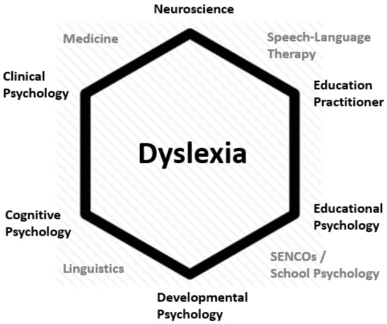 I do feel that there are some discipline-protective thinking patterns in the field of dyslexia research, and inter-disciplinary collaborations are one avenue past that. There is a very famous Trends in Cognitive Science paper [23], which uses a hexagon to describe interdisciplinary research. The idea was that each line running around and through the hexagon represented a unique area of investigation. I have re-created the figure below with respect to dyslexia (see Figure 3), and have intentionally left the lines out of the middle of this figure because they do not refer to unique areas of research (at least at this point in time). However, I find the figure useful in terms of judging the strength of research reports, and, perhaps more importantly, research proposals. The idea is that strength is inherent in the number of interconnecting lines within the figure (i.e., the interdisciplinary composition of the research team).