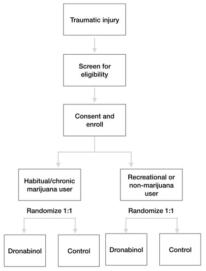 This is an open label RCT being performed at a single level I trauma center: St. Anthony Hospital in Lakewood, CO. This RCT was designed primarily to determine whether adjunctive dronabinol reduces opioid consumption compared to control. The study was designed with a stratified randomization by baseline marijuana use, which is intended to determine whether the treatment effect of dronabinol is greater in chronic marijuana users compared to recreational or non-marijuana users. This stratified randomization design was incorporated based on the gestalt that cannabis-based medication has a greater benefit for marijuana users.