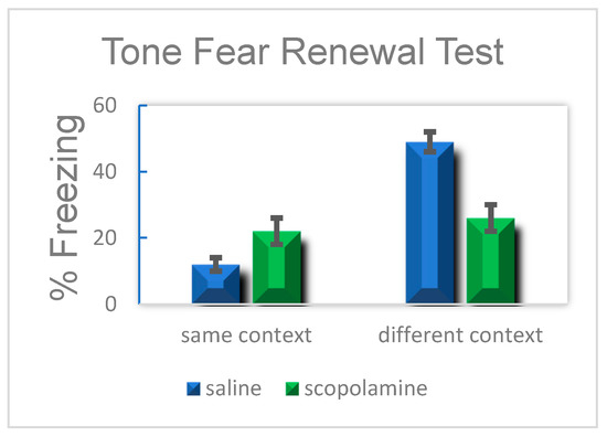 Mean percent freezing in animals assigned to either fear extinction (left) or different (right) context. Animals in the different context with systemically administered scopolamine did freeze at a percent that was significantly different from animals placed in the fear extinction context, indicating that they did not experience fear renewal (From Zelikowsky et al. 2012)