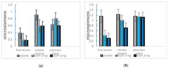 These preclinical data suggest that scopolamine may be used clinically in tandem with exposure therapy to prevent the re-emergence of fear/anxiety symptoms following exposure therapy. A recent human study conducted by Craske et al. [92]. explored this possibility by examining the effect of scopolamine on fear extinction and renewal on subjects with social anxiety and public speaking phobia. Evaluation of scopolamine dosage effects in rodents indicated a more selective disruption of contextual learning only for lower doses [85,86]. In another study, participants were randomly assigned an intranasal dose of placebo, 0.5, or 0.6 mg of scopolamine 30 min prior to exposure sessions. Each exposure session consisted of an auditory cue to indicate onset of a 1 min virtual reality public speaking task. The same auditory cue was presented to indicate termination of the task. Following these exposure sessions, the subjects were tested for short- and long-term extinction and context fear renewal. The results indicated that both scopolamine groups had significantly lower fear response to the CS, and lower anxiety after the virtual public speaking task following the presentation of the CS auditory cue across exposure sessions. The scopolamine groups also trended toward a significant dampening of response during the extinction and context renewal tests (Figure 2).