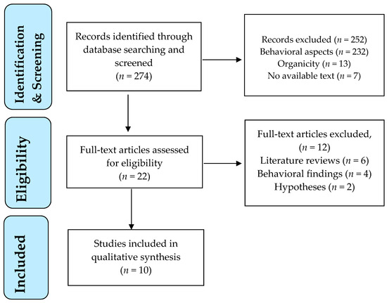 The electronic database search retrieved 274 publications (Figure 1). All titles and abstracts were screened for their relevance to the topic. Twenty-two articles were identified as potentially relevant after screening of titles and abstracts. These studies were assessed for eligibility in full text. Of these, 10 studies met the eligibility criteria and were included in the review, dating between 2008 and 2019. The main reasons for study exclusion were: inclusion of behavioral findings with no neurobiological variables and literature reviews or hypotheses without research confirmation.