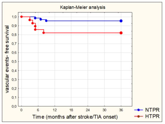 Patients with HTPR exhibited a higher risk for recurrent vascular events compared with patients with NTPR (17,9% vs. 4,6%). We noticed similar results as Rao et al. (HTPR vs. NTPR; 18.9% vs. 5.8% p = 0.006) and lower levels than Yi et al. (HTPR vs. NTPR; 31.3% vs. 12.4% p < 0.001) and Zhang et al. (HTPR vs. NTPR; 46.6% vs. 17.5%; p < 0.001), but found the same tendency. Zhang et al. enrolled all types of stroke, including cardioembolic. This could explain the higher rates of recurrent events as opposed to ours. A multicenter meta-analysis verified that aspirin-resistant subjects have a higher risk (relative risk (RR) = 1.81) of recurrent cerebrovascular events []. Consistent with those results, we demonstrated a significant role of aspirin resistance as an independent predictor of recurrent multiple vascular events.