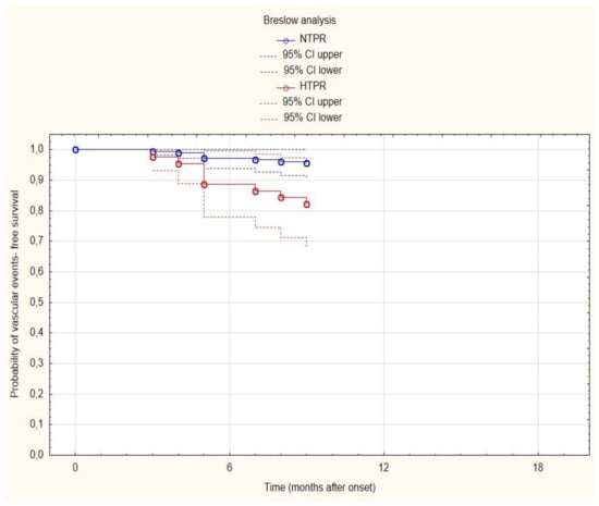 Curves of the probability of vascular event-free survival depending on time (for transparency, reduced to 18 months) in normal on-treatment platelet reactivity (NTPR) subjects—blue line; and high on-treatment platelet reactivity (HPRT) subjects—red line.