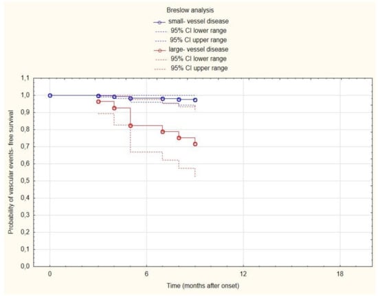 Curves of the probability of vascular event-free survival depending on time (for transparency, reduced to 18 months) in small-vessel disease subjects—blue line; and large-vessel disease subjects—red line.