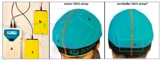 An illustration of a tDCS setup (Sooma Oy, Helsinki, Finland). a. Battery-driven stimulator. b. Anode. c. Cathode. * The reference electrode over the shoulder is not shown.