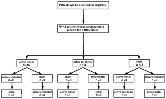 Randomization will be performed by a researcher who will not be in contact with patients. In the first step, six different sets of blocks will be assigned, and each contains four patients: (active cathodal cerebellar, sham, active anodal motor), set B (active cathodal cerebellar, active anodal motor, sham), set C (sham, active cathodal cerebellar, active anodal motor), set D (sham, active anodal motor, active cathodal cerebellar), set E (active anodal motor, sham, active cathodal cerebellar), and set F (active anodal motor, active cathodal cerebellar, sham). In the second step, each set will be split into two subsets according to the sham setup, so that two patients per set will receive sham over the motor cortex (setup similar to active condition), and the other ones will receive sham over the cerebellum (setup similar to active condition). The flow chart of the protocol is displayed in Figure 2. The evaluators will assess the patients before and after tDCS blocks and will be blind to the stimulation conditions. Patients will be blind to the stimulation condition.