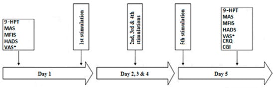 The schematic diagram of the study protocol. 9-HPT: Nine-Hole Peg Test; CGI: Clinical Global Impression; CRQ: Comfort Rating Questionnaire; HADS: Hospital Anxiety and Depression Scale; MAS: Modified Ashworth scale; MFIS: Modified Fatigue Impact Scale; VAS*: Visual Analogue Scale for the pain recorded one week before and after the beginning of each block.