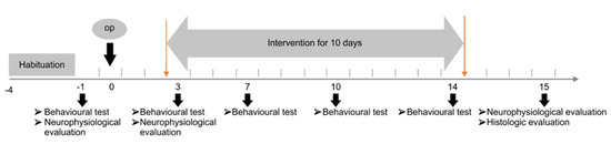 Male 8-week-old Sprague-Dawley rats (weighing 230–250 g) were used. Rats were purchased from a commercial experimental animal center and housed in the colony room under controlled temperature (22 °C) and 12-h light/dark cycle throughout the protocol with free access to food and water. Before experimentation, all rats were subjected to habituation periods for experimental tasks such as the rotarod task for three days [7,16]. With the exception of the sham operation group, other groups received MCAO. Rats were included for experimentation if they scored 8–12 points on the Garcia test used for evaluating motor impairment 72 hours after the operation, and were used for subsequent experiments. The rats were divided into the sham operation, control, rTMS, and combination groups by random allocation. The rTMS group received rTMS treatment only. The combination group received rTMS, followed by exercise treatment. The sham operation and control groups received sham stimulation. The experimental procedures (Figure 1) were approved by the Institutional Animal Care and Use Committee (IACUC) of the preclinical research institute at Chungnam National University Hospital (CHUH-016-A0012-1).