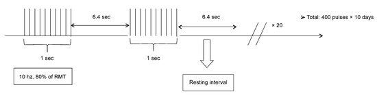 - Jung, S.H.; Shin, J.E.; Jeong, Y.-S.; Shin, H.-I. Changes in motor cortical excitability induced by high-frequency repetitive transcranial magnetic stimulation of different stimulation durations. Clin. Neurophysiol. 2008, 119, 71–79. [Google Scholar] [CrossRef]