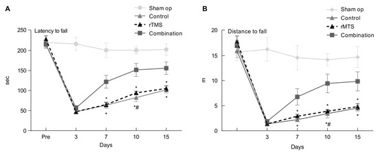 The latency to fall (A) and distance to fall (B) of the rotarod test showed a significant decrease from three days to 14 days in the permanent middle cerebral artery occlusion rat model compared with pre-operation. The combination group had a significant difference with rTMS and control groups (p < 0.05). Values are mean ± SEM. * p < 0.17 versus combination group. # p < 0.17 versus the rTMS group.