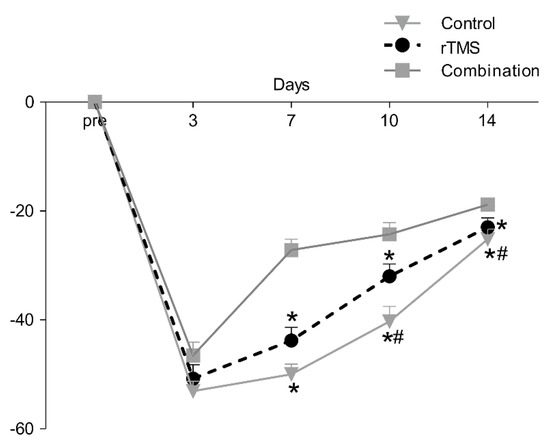 The total score for the Garcia test (% of pre) are shown. The significant decrease from three days to 14 days in the permanent middle cerebral artery occlusion rat model compared with pre-operation. The data showed that there was a significant difference among the three group (p < 0.05).Values are mean ± SEM. * p < 0.017 versus combination group. # p < 0.017 versus the rTMS group.