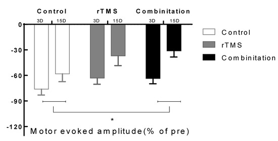 Motor evoked potentials amplitude change between 3 and 15 days. A significant difference was seen in the combination group compared with the control group (* p < 0.017). Values are mean ± SEM. * p < 0.17 versus combination group.