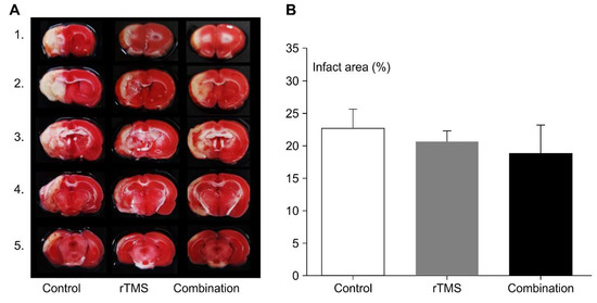 TTC staining was performed on day 15. Results are shown in Figure 6. The infarction area in the control, rTMS, and combination groups were 22.72 ± 2.87, 20.70 ± 1.63, and 18.84 ± 2.49%, respectively. There were no significant differences among the three groups (p > 0.05).
