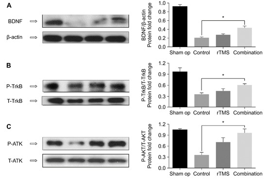 Cortical tissues in the ipsilateral hemisphere excluding the infarct area were used for western blotting. The protein levels of BDNF, P-TrkB, T-TrkB, P-AKT, and T-AKT are shown in Figure 7. A Kruskal–Wallis test revealed higher protein levels of BDNF, p-TrkB, and p-AKT in the combination group compared to that in the control group (p < 0.017), but not in the rTMS group. No significant differences were observed between the two intervention groups. Spearman’s test revealed significant correlation was observed between increases in BDNF and change in MEP amplitude (r = 0.598, p < 0.05).