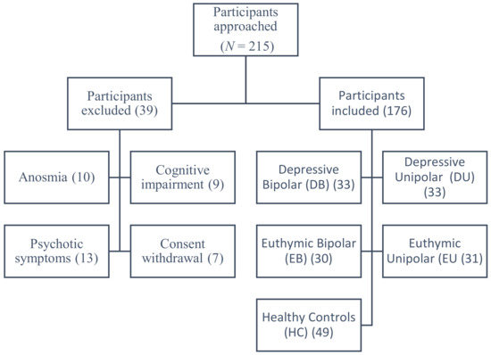 Over 18 months, 215 participants were approached (Figure 1), and 176 participants were included in five groups: DU (n = 33), DB (n = 33), EU (n = 31), EB (n = 30), and healthy controls (HC; n = 49). Thirty-nine participants were excluded for the following reasons: anosmia (n = 10), cognitive impairment (n = 9), presence of psychotic symptoms (n = 13), and consent withdrawal (n = 7).