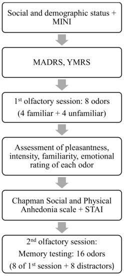 - Kazour, F.; Richa, S.; Desmidt, T.; Lemaire, M.; Atanasova, B.; El Hage, W. Olfactory and gustatory functions in bipolar disorders: A systematic review. Neurosci. Biobehav. Rev. 2017, 80, 69–79. [Google Scholar] [CrossRef]