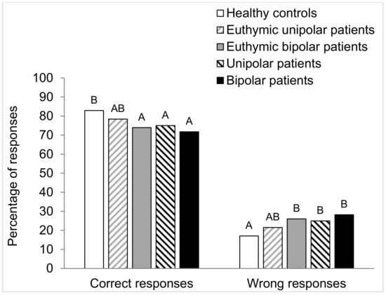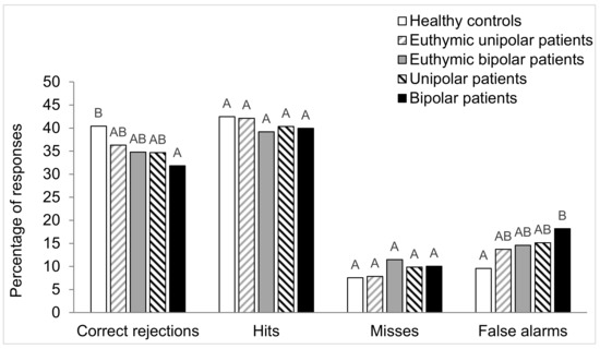 Concerning the total correct responses (hits and correct rejections), the Chi-squared test showed a significant difference between the five groups (χ2 = 27. 9; p < 0.001). The Marascuilo procedure demonstrated less correct answers in DB, DU, and EB patients compared to healthy controls (Figure 3). For the total wrong responses (misses and false alarms), the Chi-squared test demonstrated a significant difference between the five groups (χ2 = 27.9; p < 0.001). The Marascuilo procedure showed that the DU, DB, and EB groups committed more errors than the healthy controls (Figure 3).