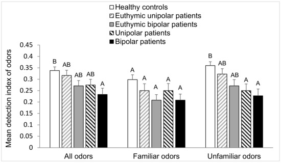 Several studies have evaluated olfactory recognition memory in depression. Zucco and Bollini showed that deficits in odor memory recognition were correlated with depressive symptoms. However, this study tested short-term olfactory memory, since the two sessions of testing were separated by only few seconds [12]. Naudin et al. (2014) [16] showed that olfactory memory is impaired in MDD. Depressed elderly patients had less correct responses and more wrong responses than healthy controls for both familiar and unfamiliar odors [16]. As for patients suffering from bipolar depressive episodes, no studies have been performed so far to evaluate olfactory memory in this population. The present study is the first to evaluate olfactory memory in bipolar depressed and euthymic patients.
